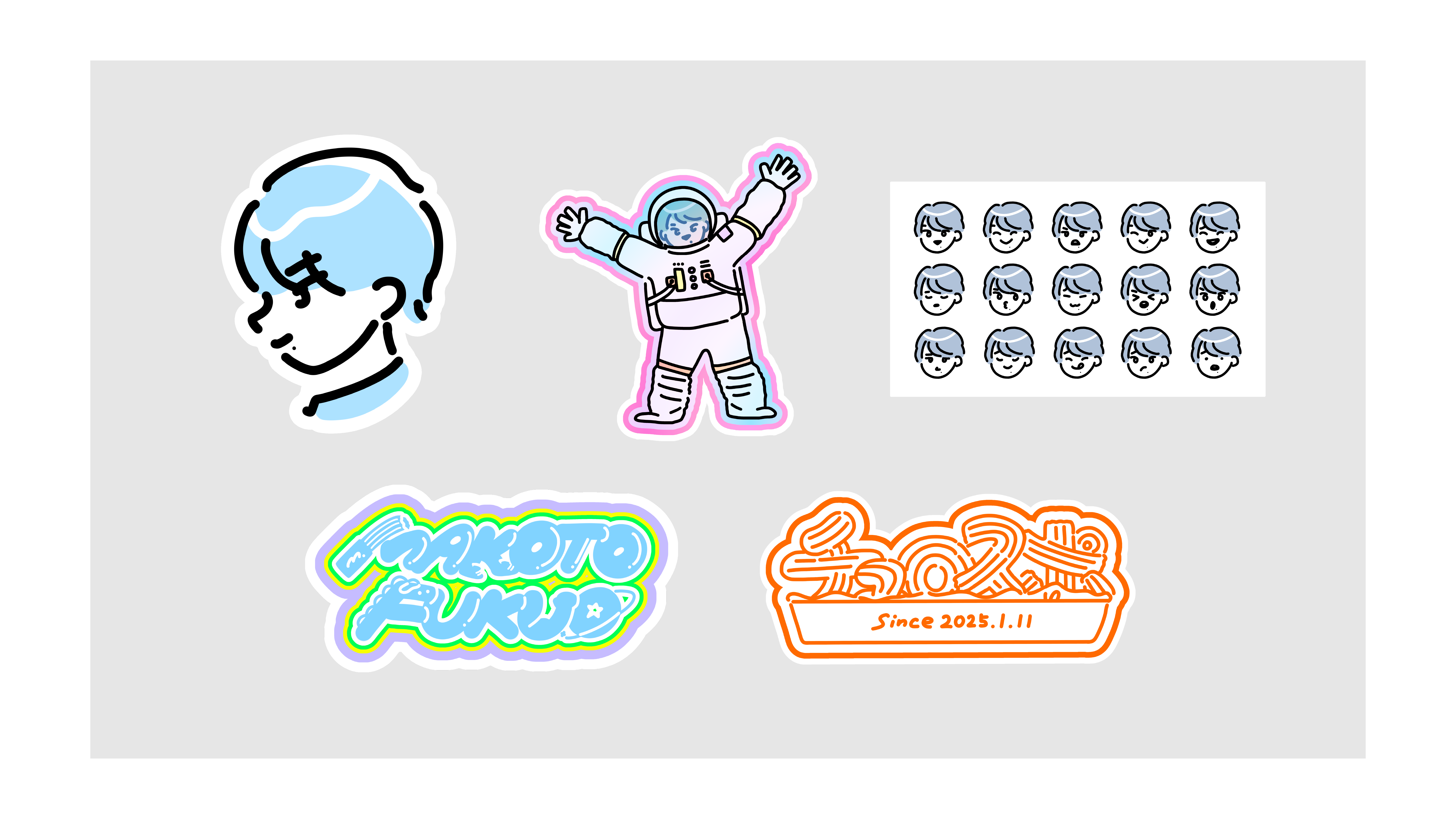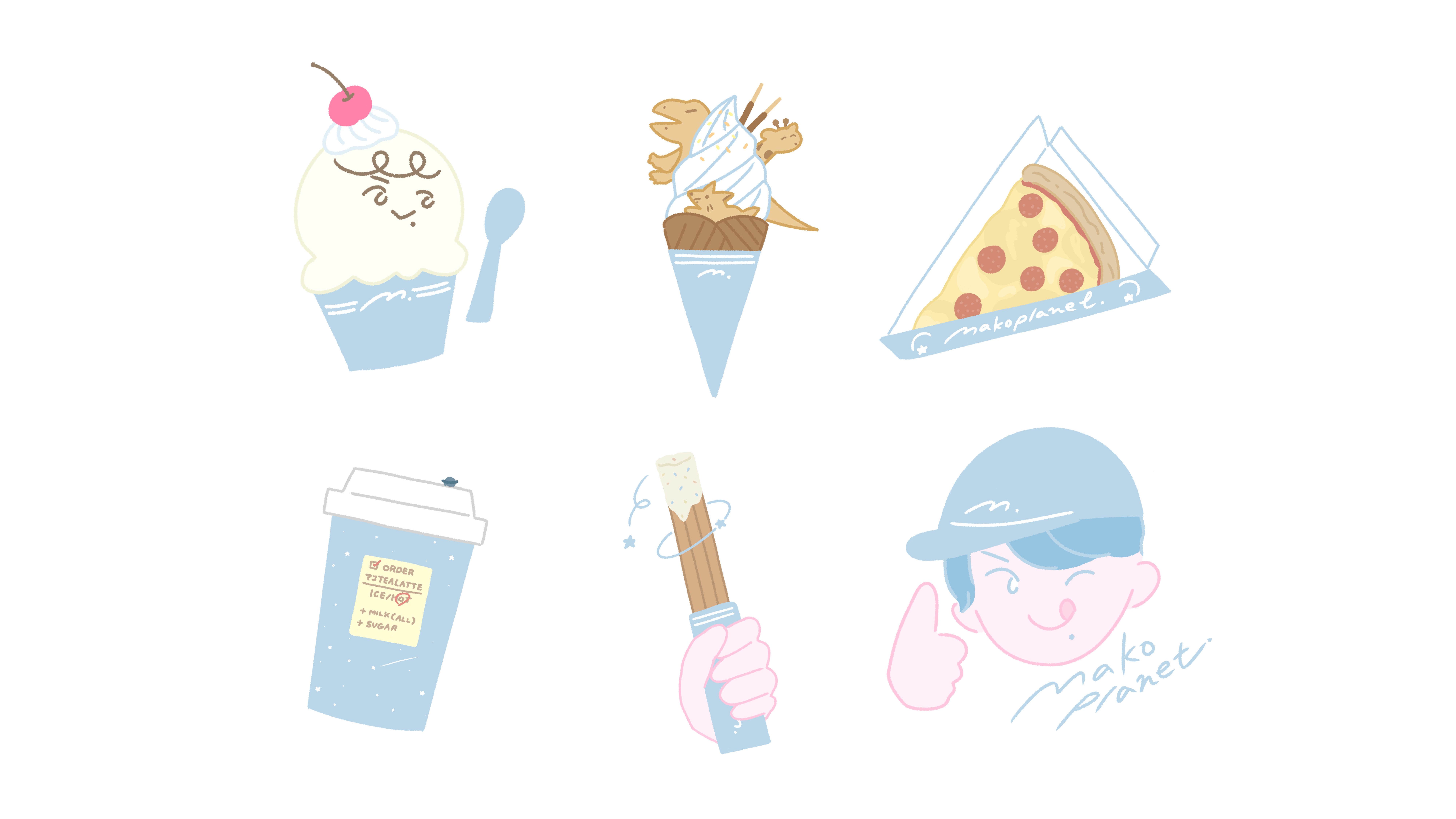 福尾が好きな食べ物のイラストを5点と、誠店長を優しく、おいしそうなタッチで描きました。バッグ等に付けても目立つポイントになるように少し大きめのサイズで製作しています。